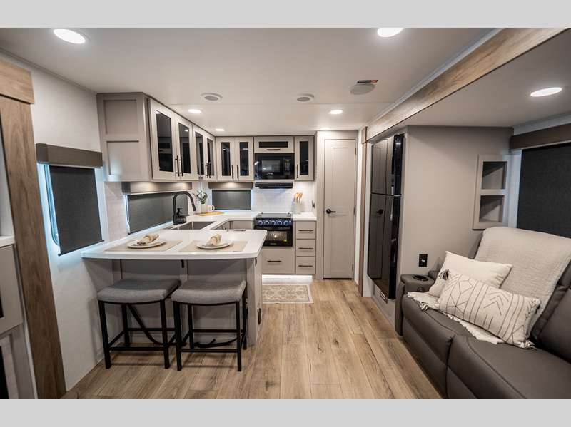 Sleeps 4 Slides 2 Length 33 ft 11 in Ext Height 11 ft 3 in Hitch Weight 841 lbs GVWR 9250 lbs Dry Weight 7316 lbs Fresh Water Capacity 45 gals Grey Water Capacity 90 gals Black Water Capacity 45 gals Available Beds Queen Refrigerator Type 12V Refrigerator Size 10 cu ft Cooktop Burners 3 Shower Size 30" x 36" Number of Awnings 2 TV Info LR 50" TV Awning Info 12' and 14' Axle Count 2 Shower Type Standard Electrical Service 50 amp Similar Floorplans