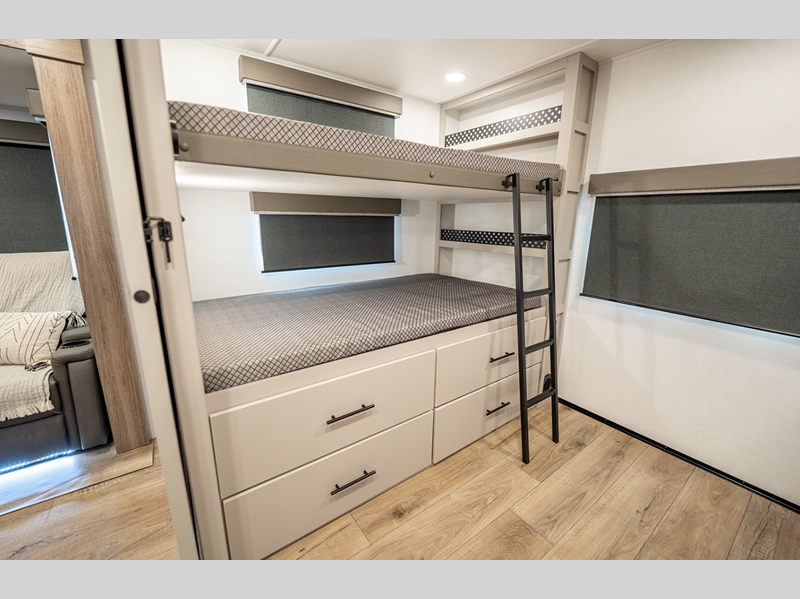 Sleeps 8 Slides 2 Length 36 ft 11 in Ext Height 11 ft 3 in Hitch Weight 872 lbs GVWR 10450 lbs Dry Weight 8253 lbs Fresh Water Capacity 45 gals Grey Water Capacity 90 gals Black Water Capacity 45 gals Number Of Bunks 3 Available Beds Queen Refrigerator Type 12 Volt Refrigerator Size 10 cu ft Cooktop Burners 3 Shower Size 30" x 36" Number of Awnings 2 TV Info LR 50" TV Awning Info 8' 6" and 12' Axle Count 2 Shower Type Standard Electrical Service 50 amp Similar Floorplans